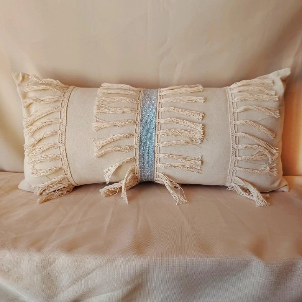 DETALLES: Franja metalizada tonalidad plata. Puntilla de flecos. (INCLUYE relleno vellón siliconado)